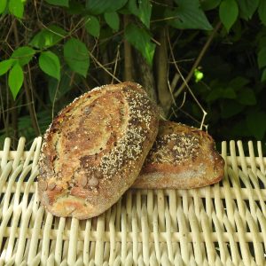 Pain complet 1kg – Farine T110 bio (moulin Mariège), flocons d’avoine bio, eau, sel, levain de blé